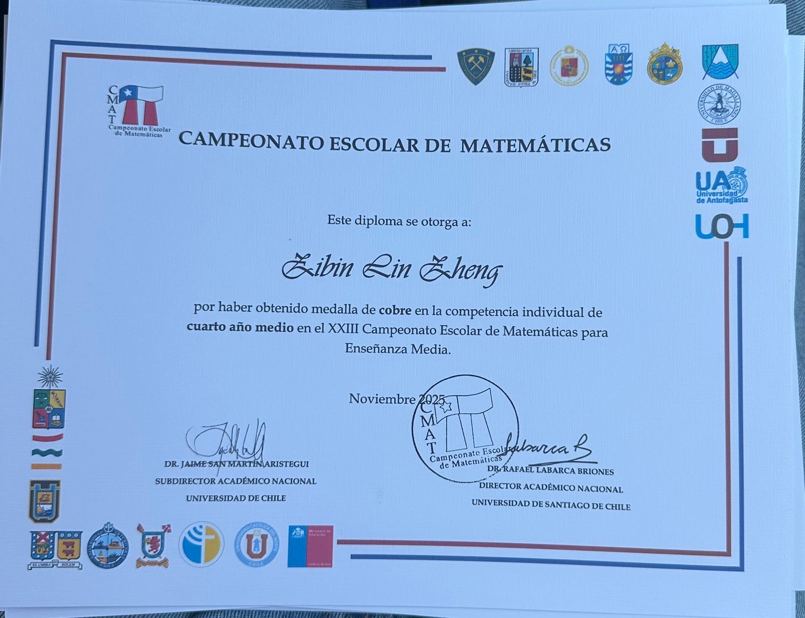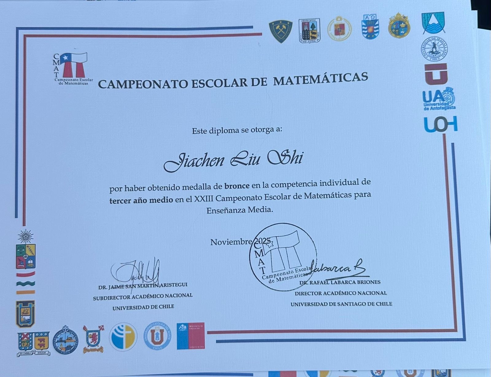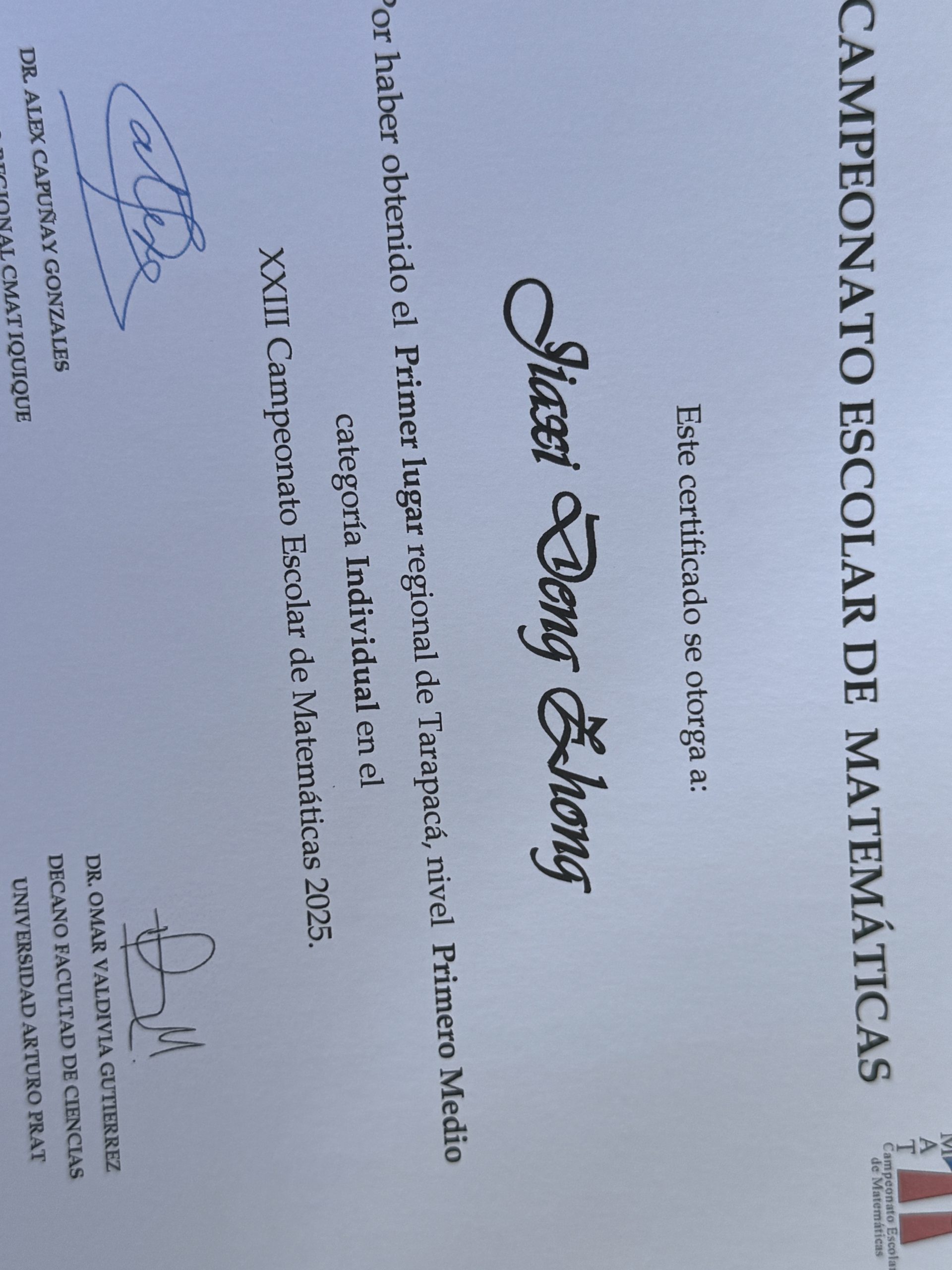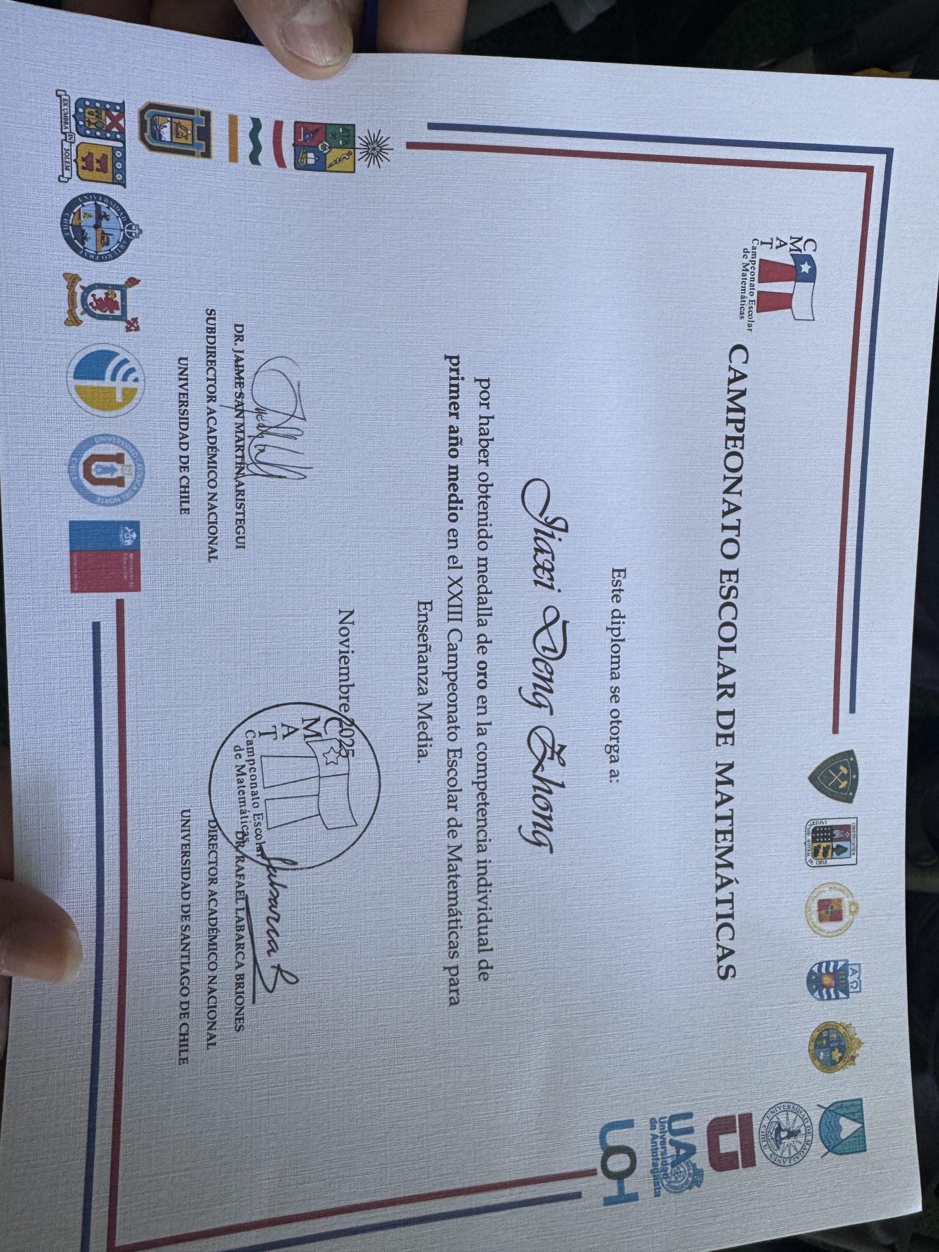 A nivel individual, destacamos a Sophie Muñoz, quien obtuvo el 4º lugar regional y 4º lugar nacional, recibiendo medalla de cobre. Jiaxi Deng alcanzó un resultado extraordinario al obtener el 1º lugar regional y 1º lugar nacional, adjudicándose la medalla de oro, un logro de gran relevancia a nivel país. Asimismo, Jiachen Liu obtuvo el 2º lugar regional y 3º lugar nacional, con medalla de bronce, mientras que Zibin Lin logró el 1º lugar regional y 4º lugar nacional, recibiendo medalla de cobre.