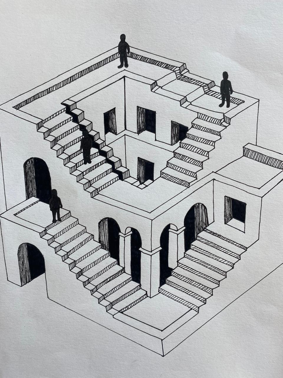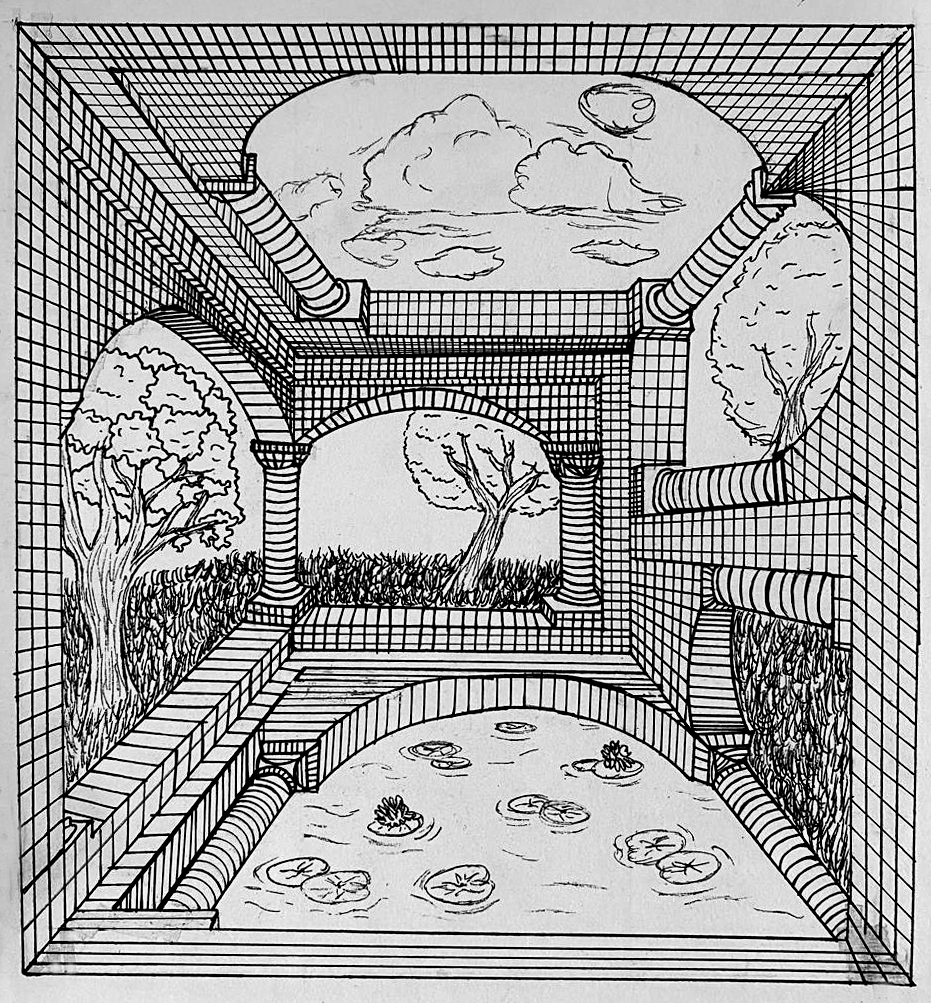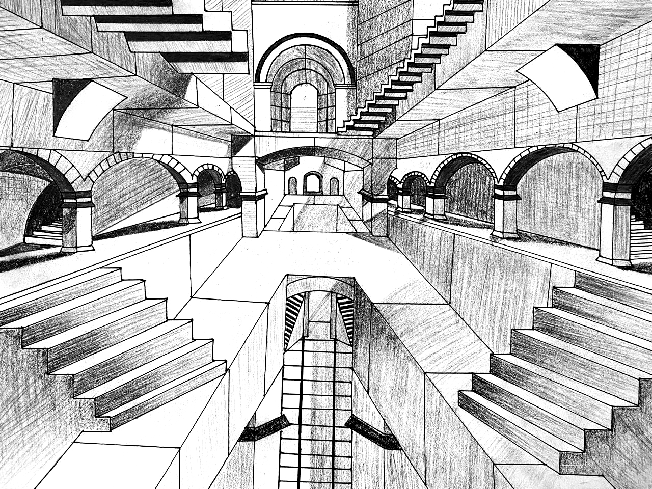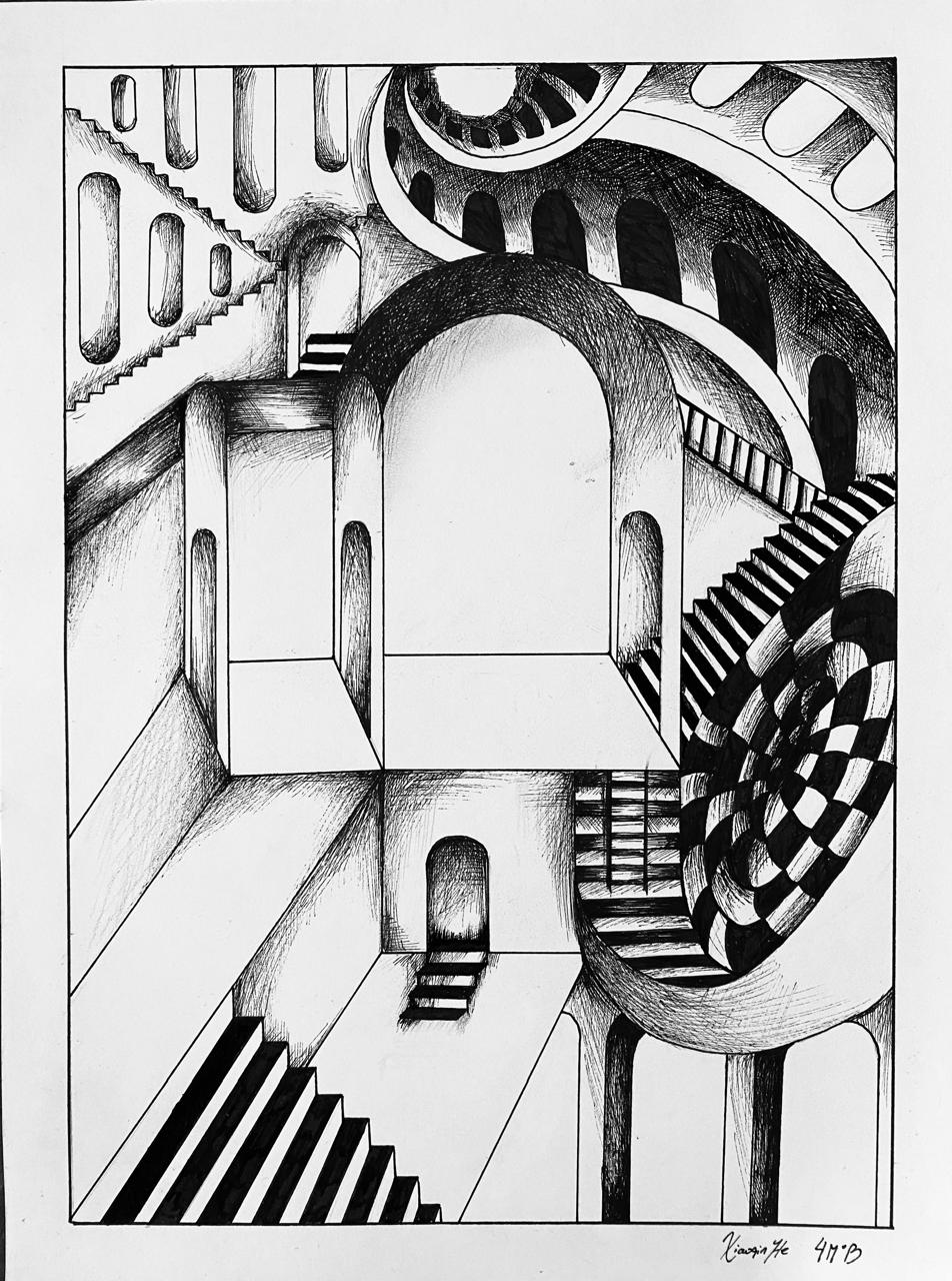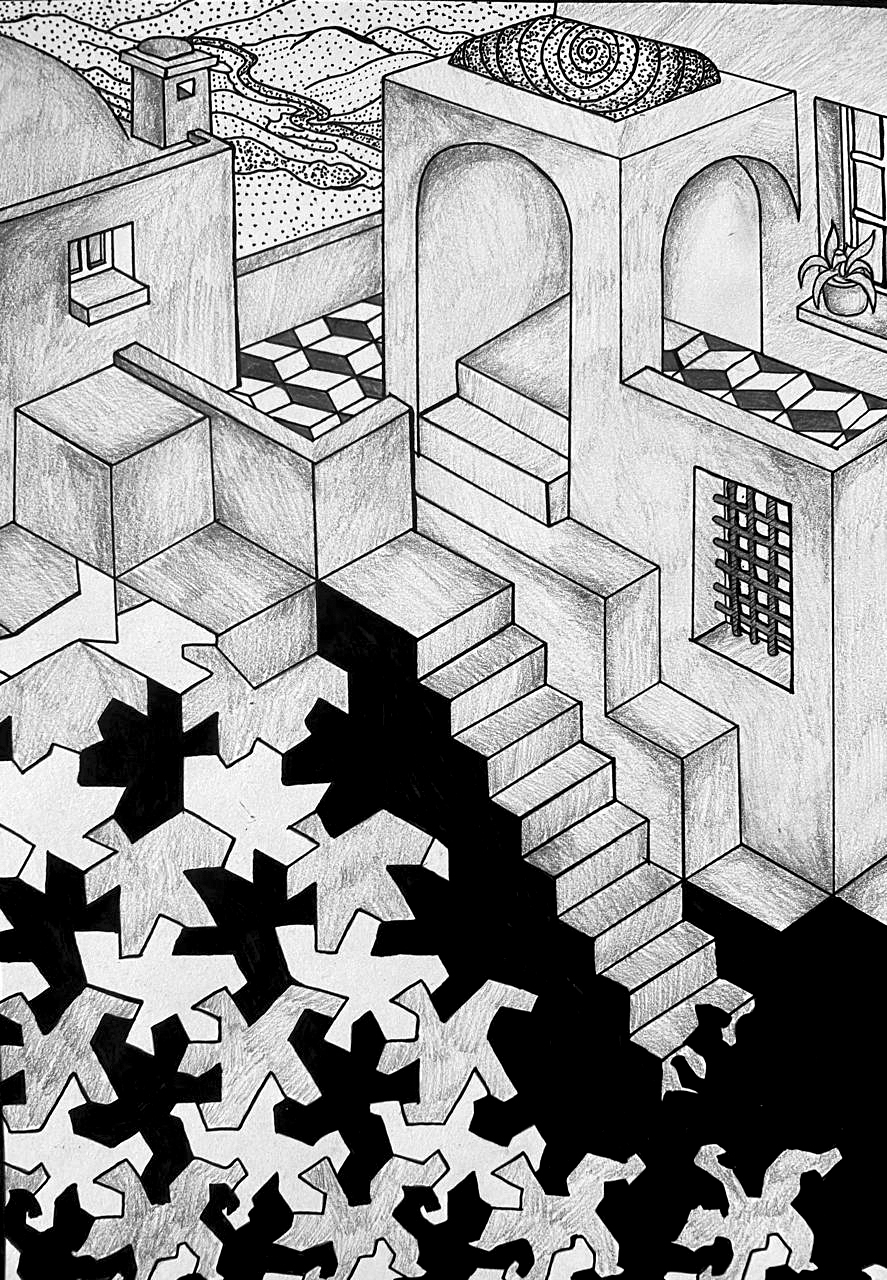 Durante el proceso, se destacó el rigor técnico y la paciencia necesaria para ejecutar trazos limpios y composiciones equilibradas. El uso del grafito permitió trabajar las sombras y profundidades, mientras que el tiralíneas otorgó la definición necesaria para que las figuras imposibles cobraran vida en el papel, demostrando un alto nivel de competencia en el manejo de herramientas profesionales.